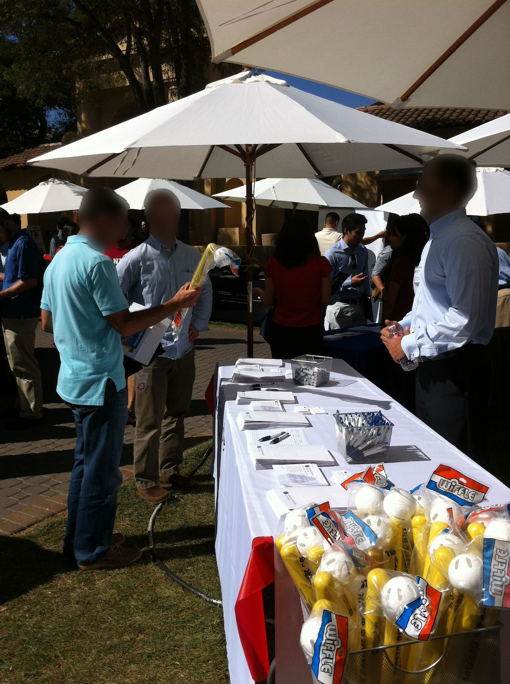 We've all seen it: rows of tables, piles of company-branded swag, wandering students on the hunt, and company representatives with nametags cheerfully beckoning. The job recruiting process, as embodied in the campus career fair, is a two-way street of storytelling. Company representatives and students tell each other stories meant to intrigue and convince, but the process can be tiring and chaotic. With crowds of students swarming a table, the risk of a communications breakdown (e.g. loss of student interest while waiting, misdirected focus of recruiter efforts, uncaptured data, etc.) is substantial. I chose to observe the storytelling involved at a career fair booth from the perspective of a user on the company side of the table, choosing two users from a management consulting firm and one user from a fast-growing software startup. My particular focus was on the means by which the users communicated their stories to students and then received information from students.