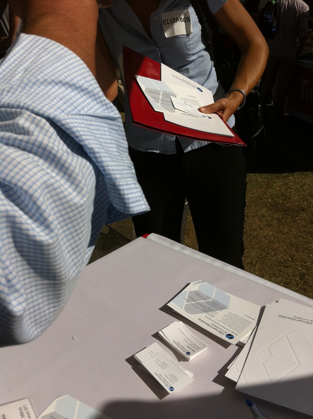 Towards the end of the career fair, User 2 goes through a list of student names scrawled onto a paper sign-up sheet to decipher illegible names and re-write the name if necessary. At the moment of the photo, she's puzzling over two student names which differ by only one letter. A single career fair can bring in nearly 200 sign-ups for a boutique firm looking to hire a handful of new graduates. With only two employees staffing the booth, User 2 likes that the printed materials can be a quick "takeaway" for students to grab while on the move – she's not sure that people would want to stand around and watch a screen while waiting to talk to someone in person. Her primary goal in the career fair is to get the word out about the firm, which has recently opened a San Francisco office, and catch the attention of talented Stanford students, and she hopes that the wiffle-ball swag will help with that (but also wishes there was some way to know what swag worked best for students).