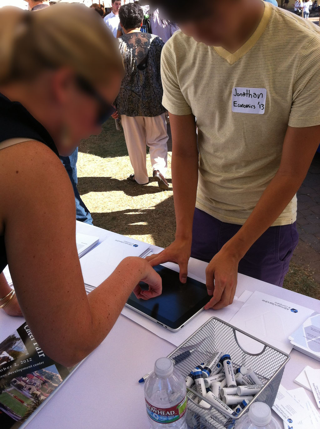Students consider the swag available at the table staffed by User 1 (pictured) and User 2: