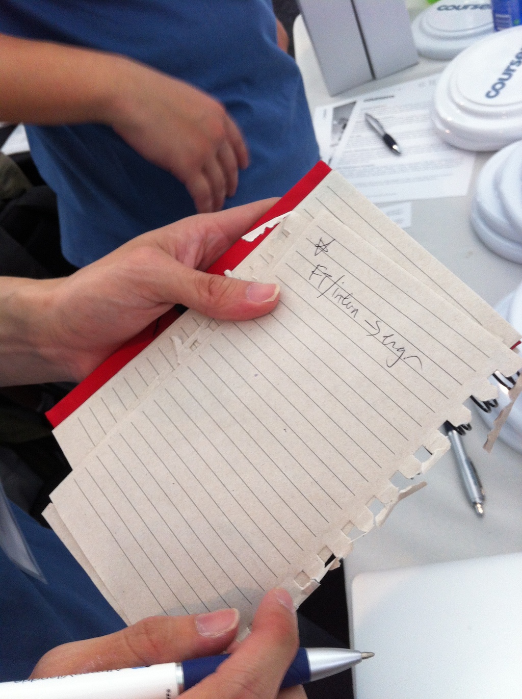 User 1 gives a student a stack of hard-copy recruiting materials in the hopes that the student will read them after leaving the table. He regrets that by the time he reviews the stack of resumes, he has forgotten which person corresponds to which resume, what they might have talked about, and what thoughts he may have had about any given student during the conversation ("why were they important to me?"). Upon receiving their resume, he makes a few notes if he has time, but points out that "it's hard to secretly write notes on a resume as it comes in, and we're bombarded with people throughout the day."