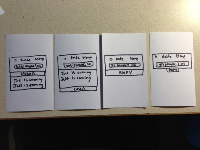 These show redesign possibilities for people that were slow or hesitant to use the close and rsvp button. The far right shows the button as is (skinny). Second and third from the right shows a variant that is wider. And the variant all the way on the left shows a variation on the wide button where the button that opens the shelf stays in a constant position. This was a a problem during the in-person test because participants were having trouble closing the shelf when the close button slipped below the fold of the phone. You can see how this can be a problem in the variant second from the left but how it it might be improved in the variation on the left.