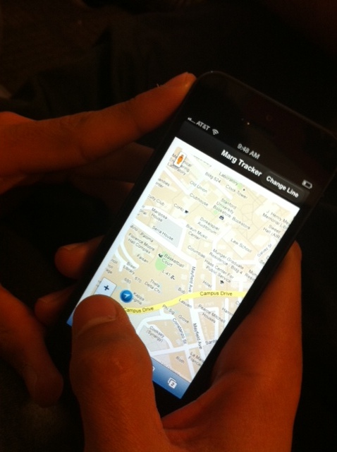 This is a prototype of the redesign. We changed the blue bus stop icons to red, numbered, stop signs (in order of the bus line path) and the bus icon now has the name of the line and the color of the line (from the Marguerite website/signs).