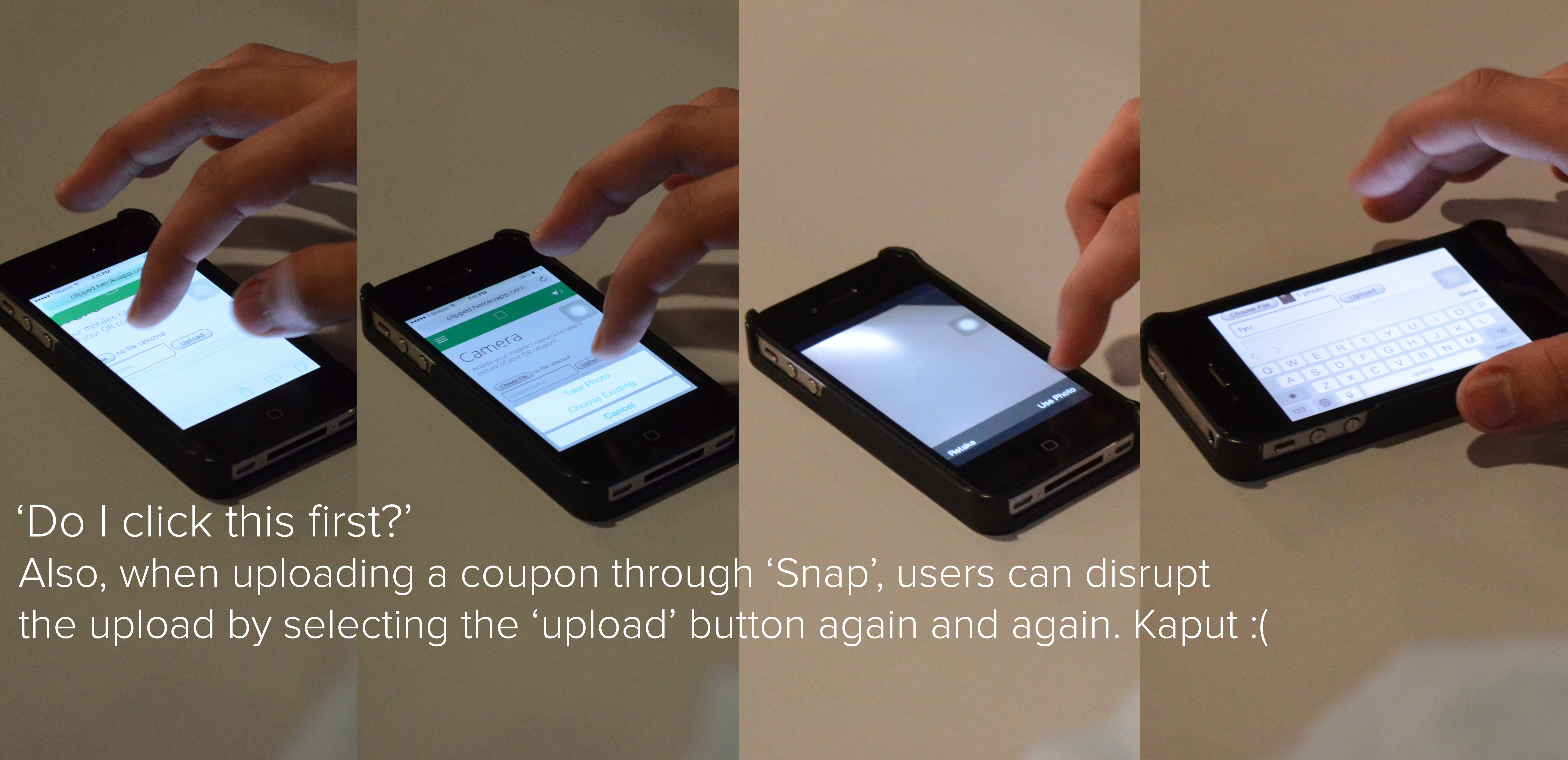 While conducting in person test, we found that one user found the snap page difficult to use. Specifically, when given the task “upload a coupon”, the user was not sure how to proceed once on the snap page. From there the user navigated to the “How To” page, skimmed the text, did not immediately find the information they needed, and then proceeded to navigate around aimlessly. We fear that this user’s experience is not unique and is indicative of the experience that many others will have. We plan on redesigning the “Snap” page to include information that instructs the user how to operate the page. This hopefully reduces the confusion that the “Snap” page causes. In the A/B testing, the A test will consist of the original design. The “Snap” page will not have any explanations on how to use the page. The B test will hold informational text, or diagrams to help the user understand the page’s functionality. Ideally, the results of the testing will be made apparent by the ratio of how many people successfully upload a coupon to the page quickly and efficiently between the two tests.