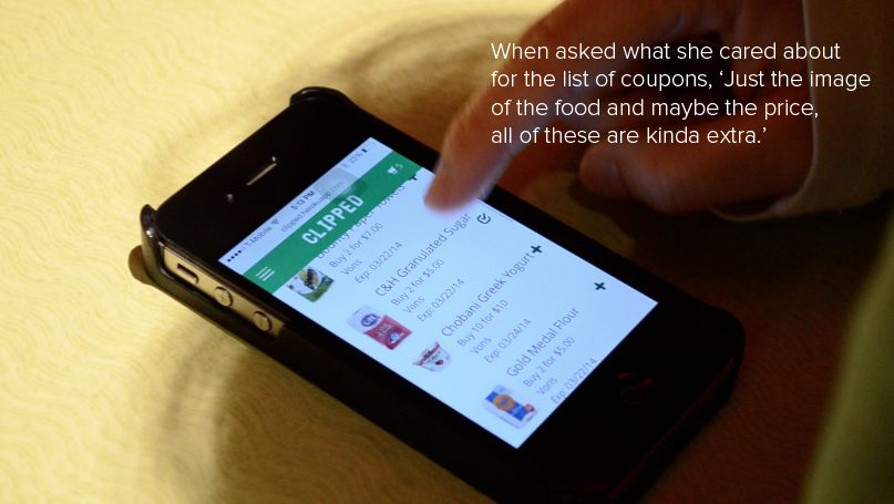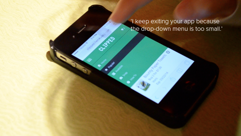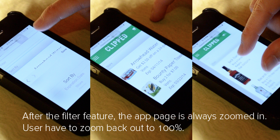 While conducting in person testing, it became apparent that when the user interacted with the drop down bar that determined how coupons are sorted, the page zooms in after a sorting parameter is selected. This did not seem to bother the user, who immediately scrolled to find the information that was cut off when the page zoomed. While the user did not express frustration, we realize this is a single view point of a user who easily navigated the page. To a user who experiences difficulty navigating, this auto zoom byproduct might be a turnoff. To determine if this zoom effect is problematic, we need to increase the sample size in order to get more data, and we will do so by turning to online testing. This testing will be conducted in A/B fashion, with the A design being our original interface (the sort functionality being placed within a dropdown menu). The B design will incorporate changes to the interface by which users select coupons sorting parameters through a series of adjacent buttons. These buttons allow for the user to see all options simultaneously while still being able to see the list of coupons, it would negate the zoom factor caused by the drop down, and if we are able to find suitable imagery to represent the sort parameters, it will promote recognition over recall. We hope that this user testing will enable us to determine the superior, and more intuitive way to display sorting parameters by inquiring as to which design the user preferred, and asking about any frustrations or annoyances faced using either one. Additionally, if images or graphics are used in the buttons to represent the parameters, we will also be looking for confusion on the part of the user when interacting with the buttons.