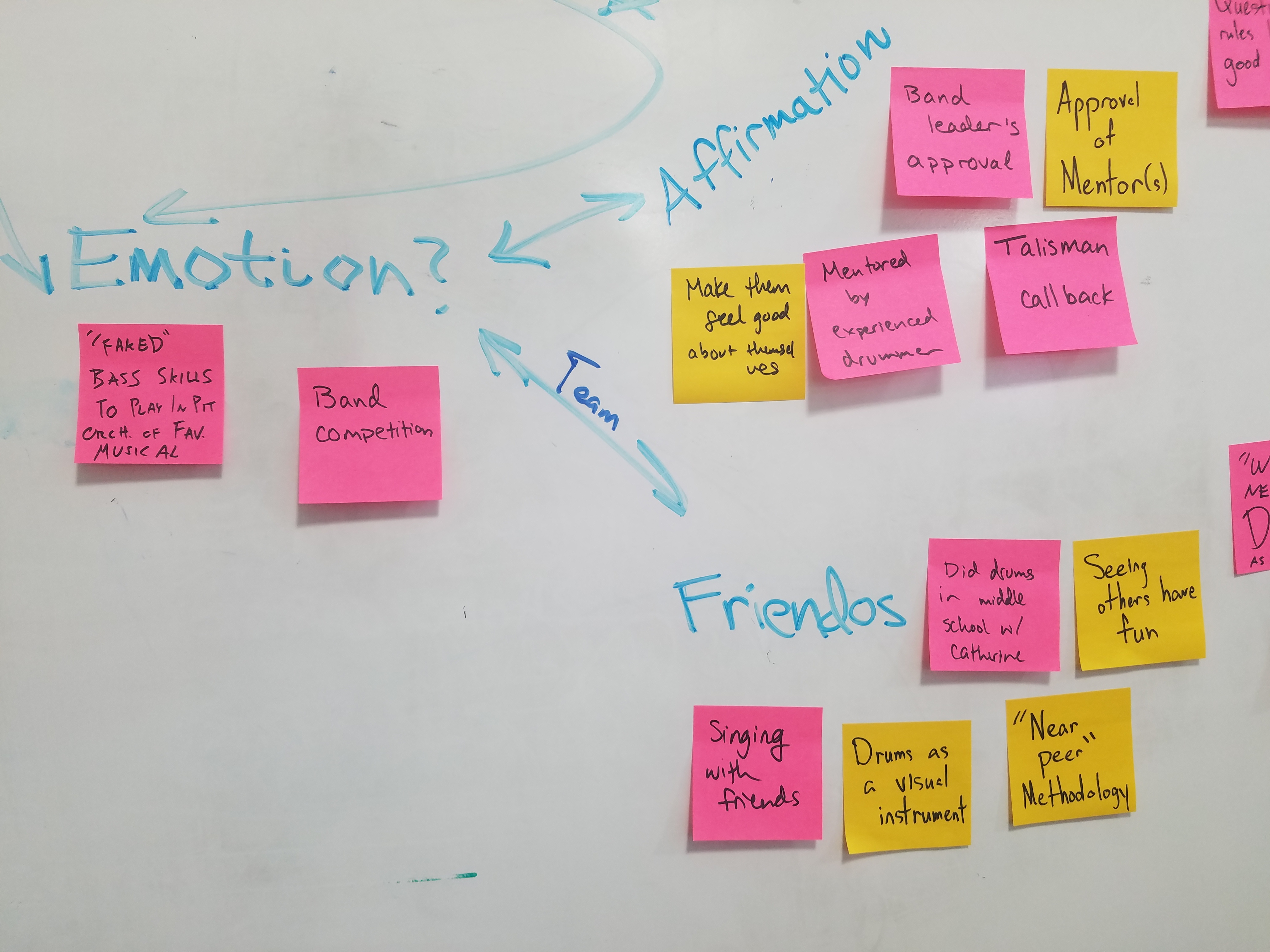 Results from initial needfinding interviews with local musicians and music instructors. People needed confidence, camaraderie, and chunks of learning.