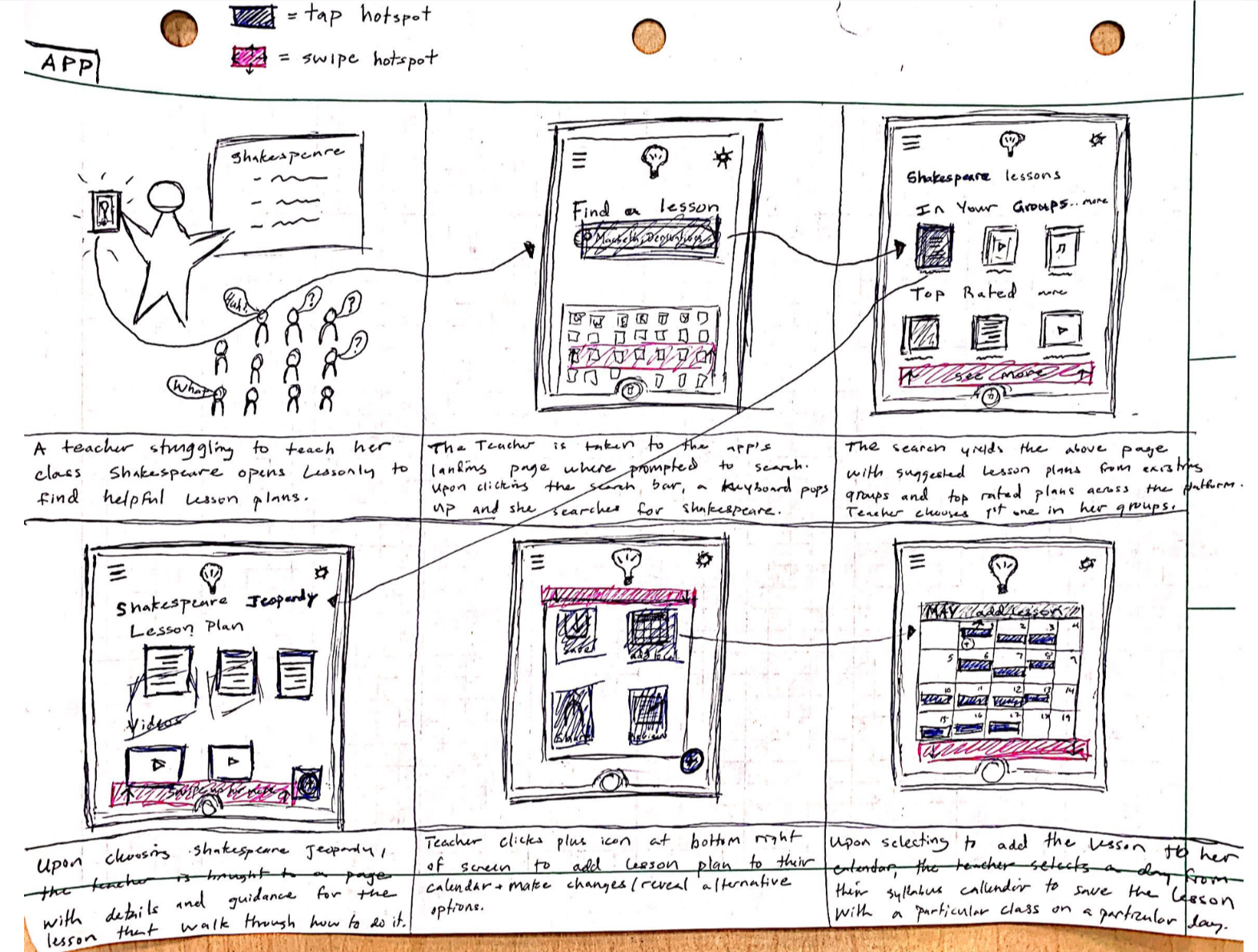 This next task for us was to learn how to use low-fi prototyping in the early stages of UI design. We went about sketching many different designs that could possibly implement our solution of Lessonly. We then selected the best of these designs to test further and from them built a low-fi prototype as well as performing a usability test. From these results, we will be able to use the information and feedback we get to improve our solution in the future.