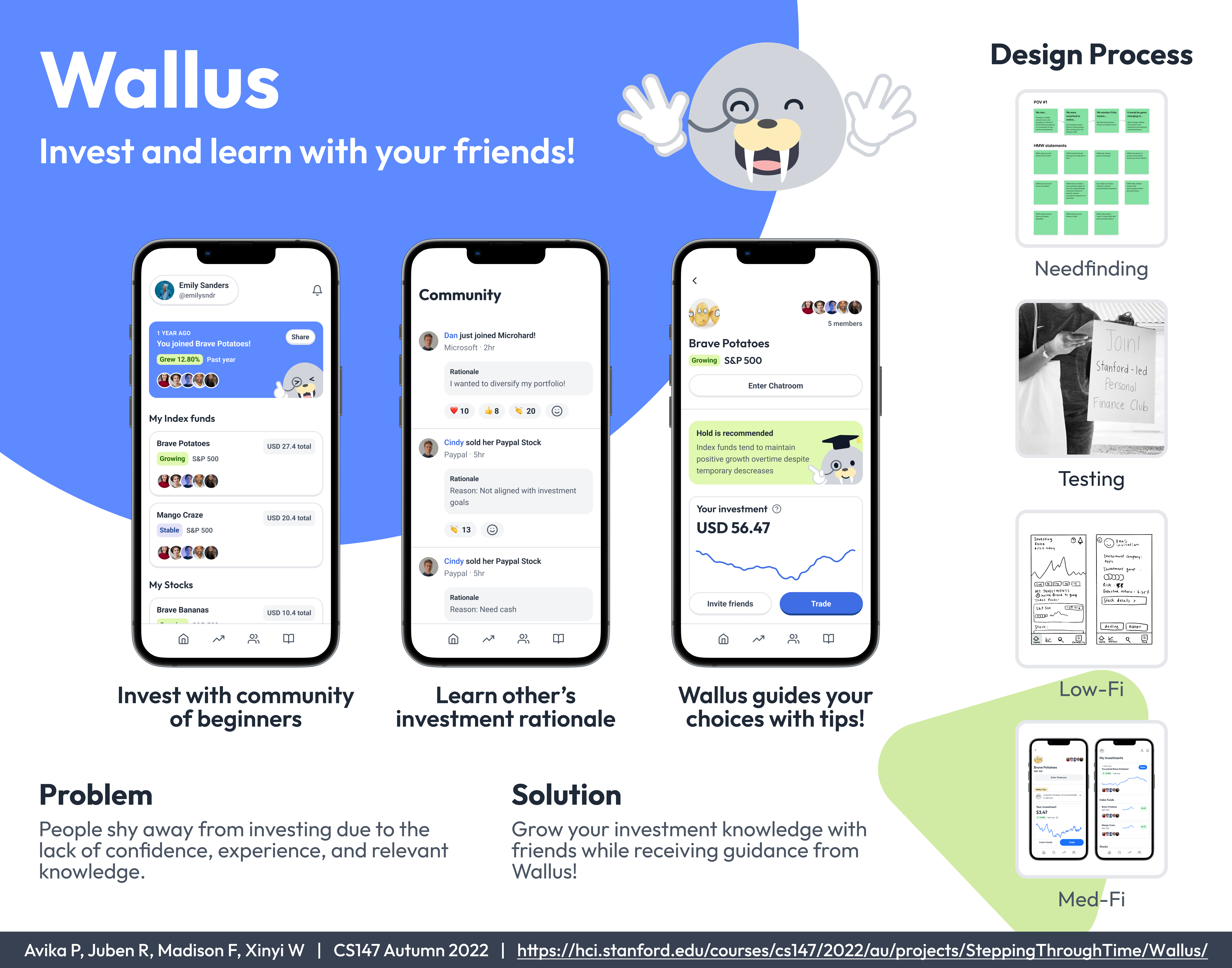 Our project name, "Wallus," combines "wallet" and "us", indicating the focus of our app being investing with friends to create a community that makes investing more accessible. Furthermore, it communicates investing being a viable option to keep one's savings.