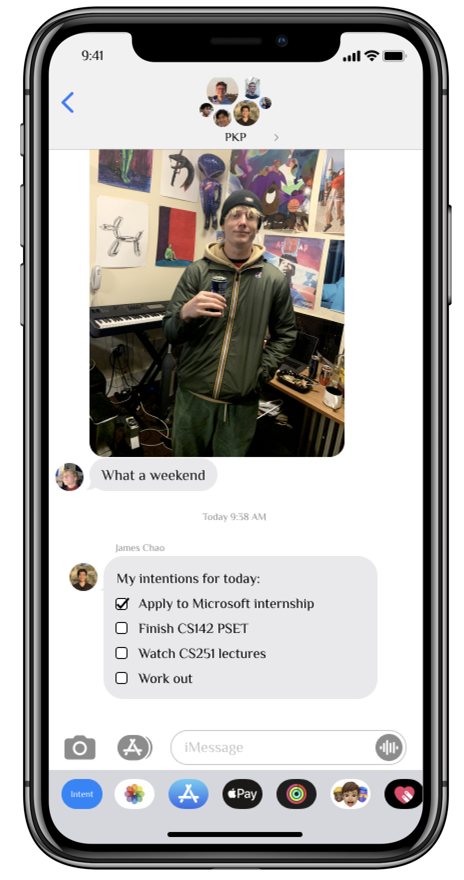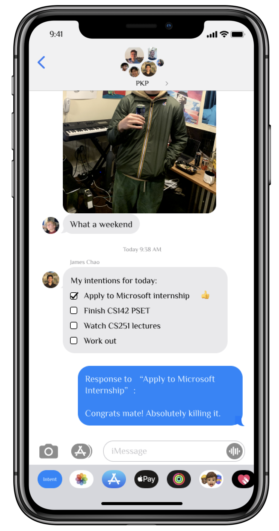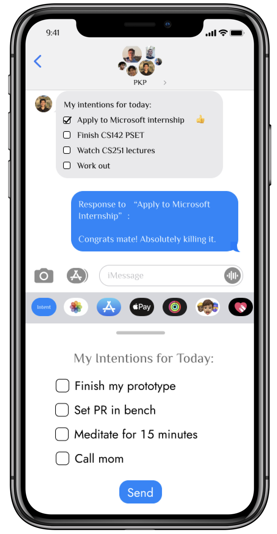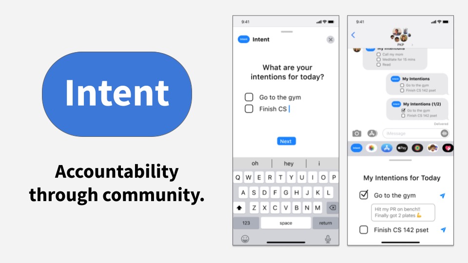 Intent is an iMessage/iOS app that makes it painless to set up accountability groups with friends. The app lives in your accountability group chat, and keeps you updated on your own and friends intentions.
