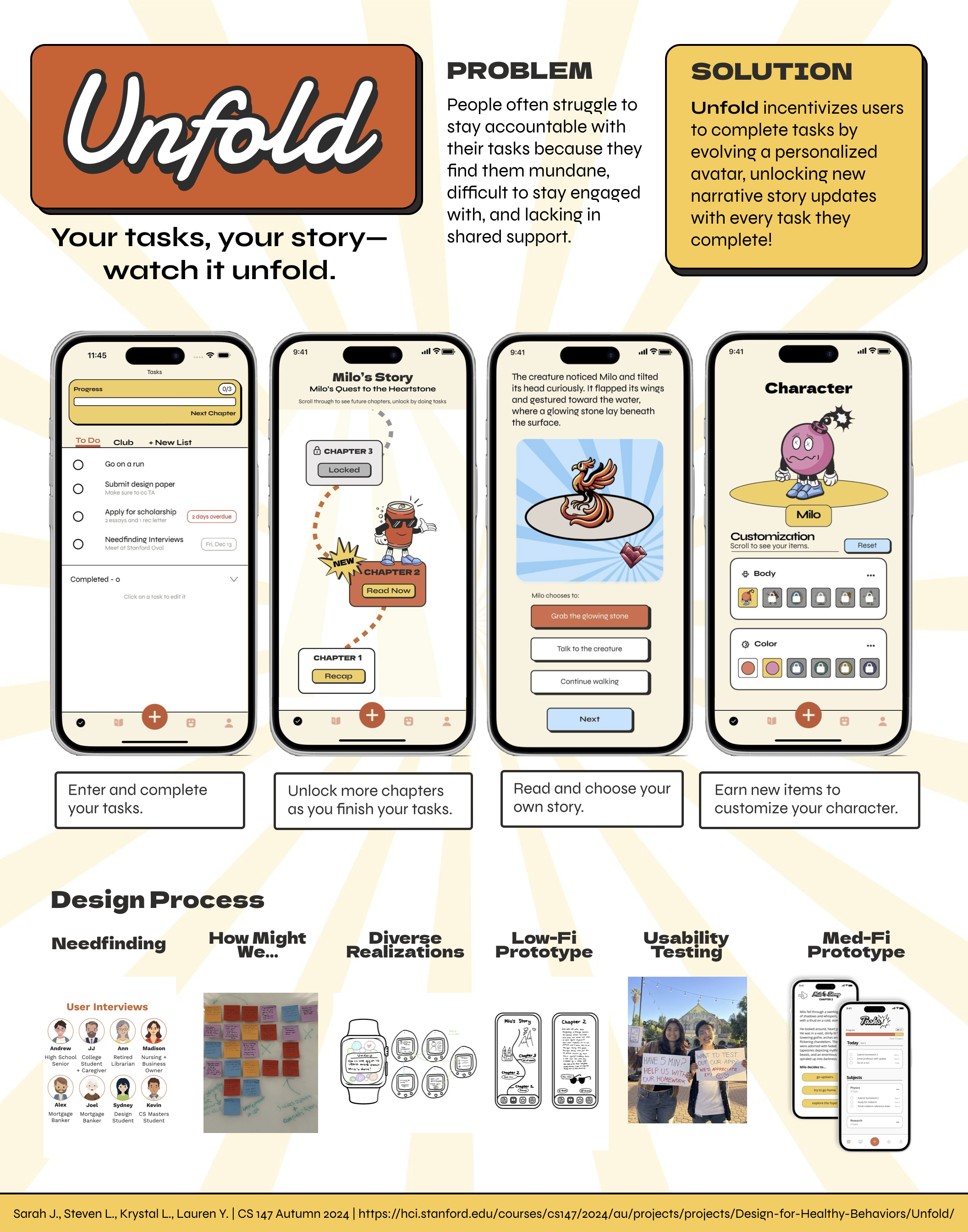 This poster showcases our CS 147 journey, starting with the needfinding stages and ending with the high-fi prototype. We presented Unfold to over 300 people at the CS 147 Project Expo on Friday, December 6th from 6 - 9pm.