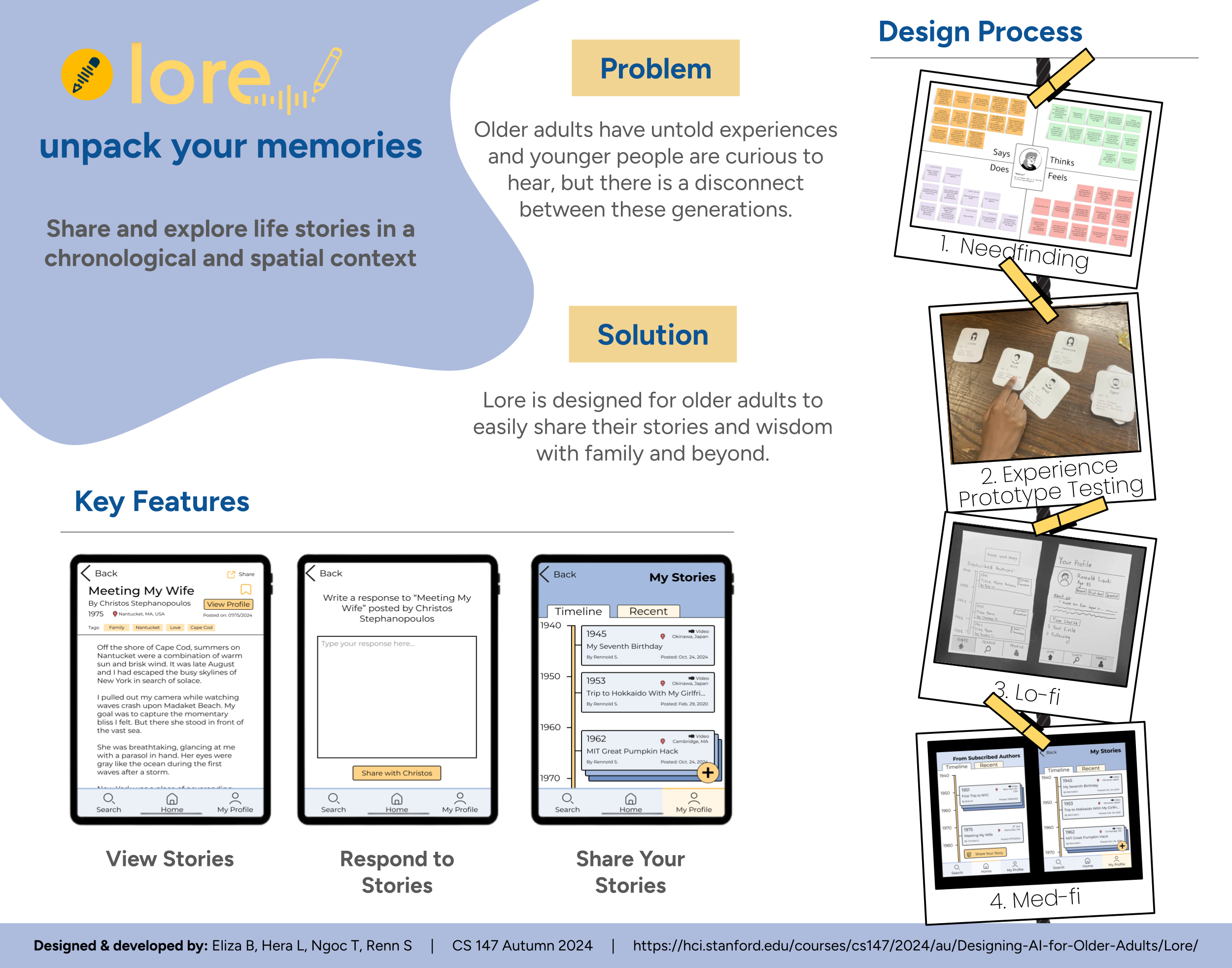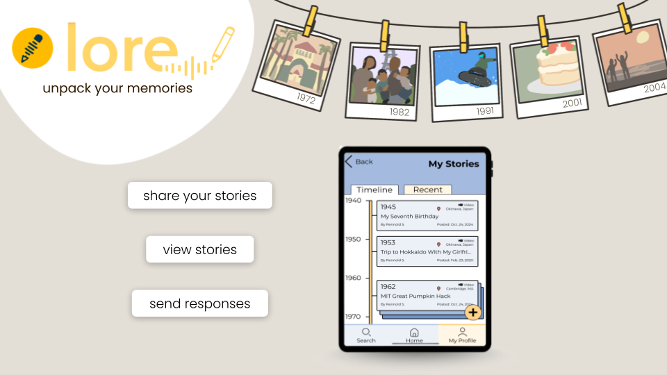 Lore is an app that empowers people to share and uncover stories across generations. Designed with accessibility in mind, Lore offers freedom for people to share about their lives using text, audio, video, photos—or any combination of the above. Your individual story posts become an organized timeline and mini memoir of your life. Uncover new stories from your inner circle of people, or from new people around the world. We believe each person's lore matters!