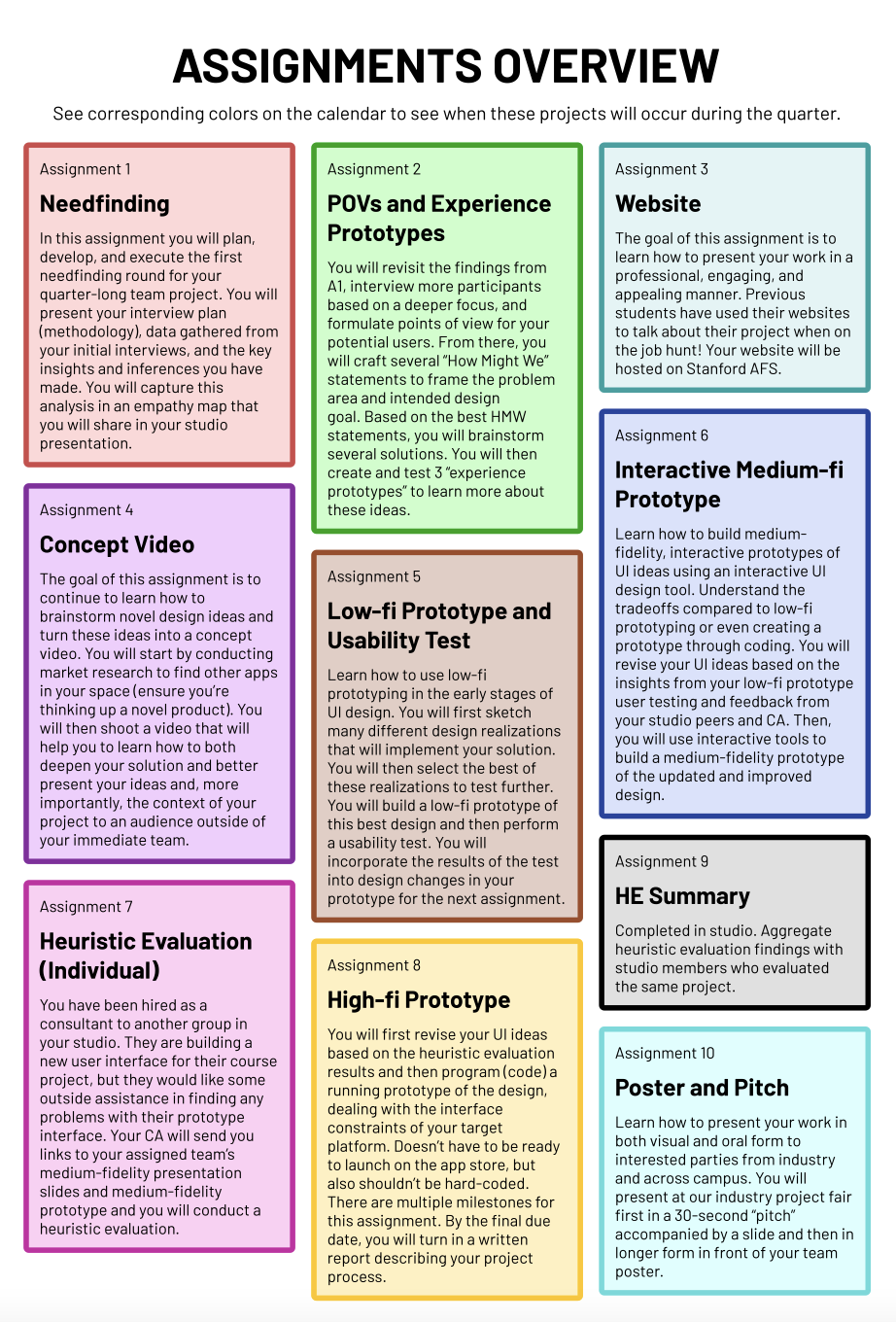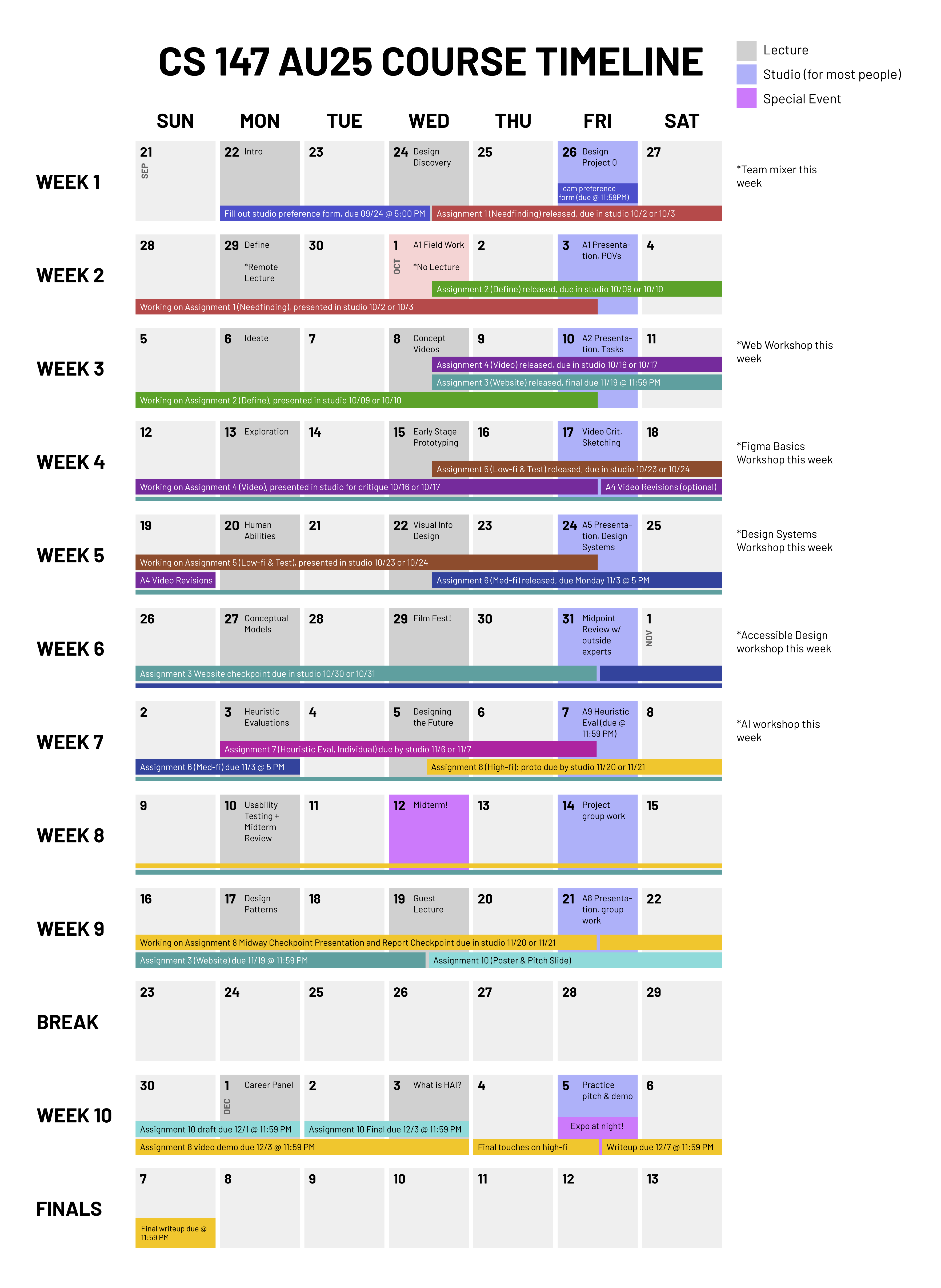 | Week | Assignments | Monday | Wednesday | Studio |