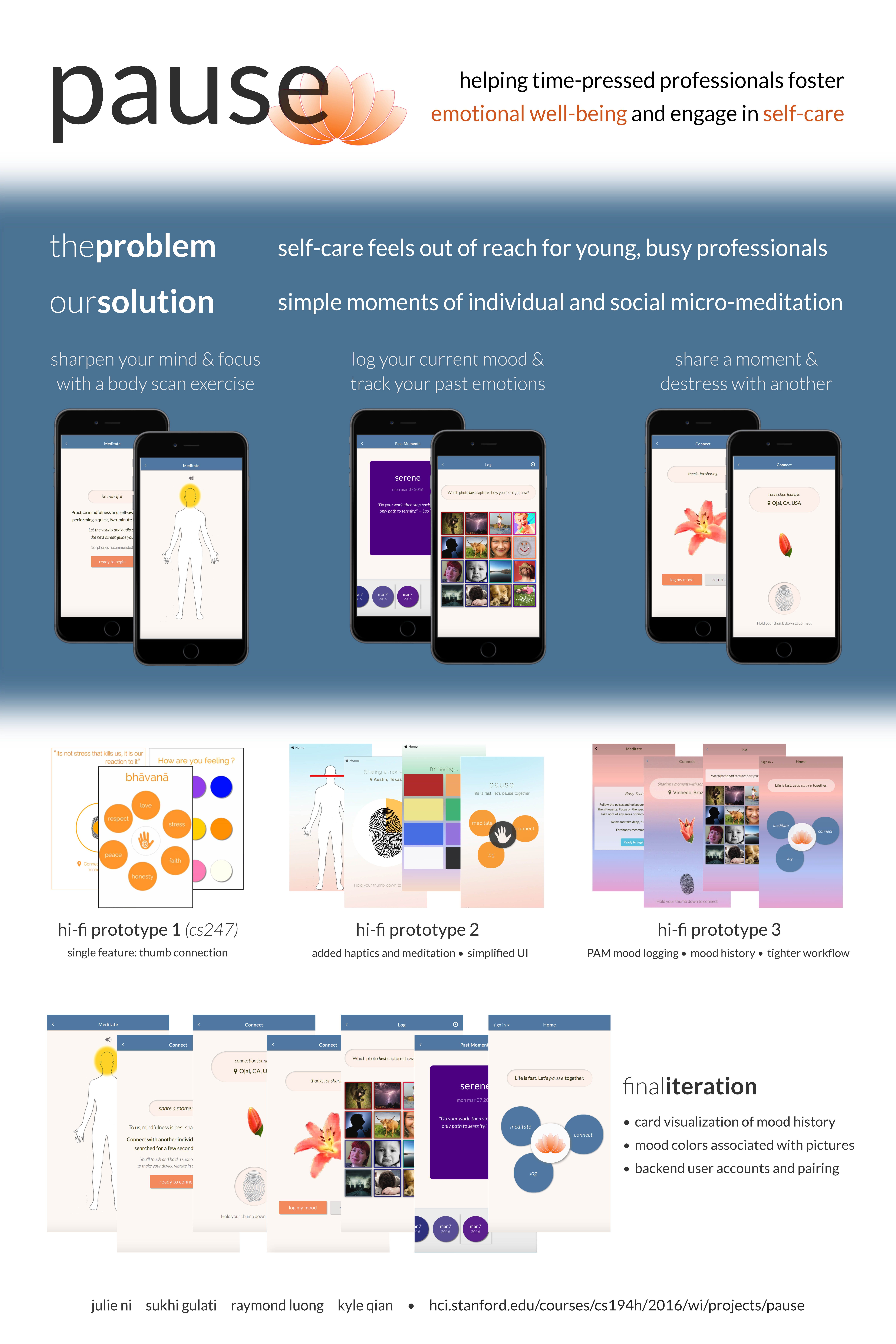 Pause is a dedicated space to practice micro-meditation and reflect on emotional well-being, allowing our active users to also be part of an anonymous community of individuals who share the common goal of dedicating time to their emotional state.