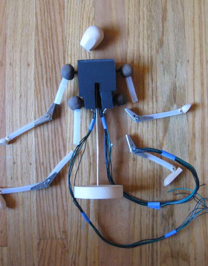 1st iteration: foamcore, tubing, sculpey, remnants of artists doll, bend sensors, potentiometers, arduino boards, Flash
